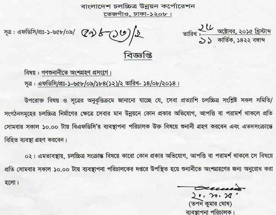 ০২। এমতাবস্থায়, চলচ্চিত্র সংক্রান্ত বিষয়ে কারো কোন প্রকার অভিযোগ, আপত্তি বা পরামর্শ থাকলে সে বিষয়ে প্রতি সোমবার সকাল ১০.০০ টায় ব্যবস্থাপনা পরিচালকের দপ্তরে উপস্থিত হয়ে শুনানীতে অংশগ্রহণের জন্য অনুরোধ করা হলো।